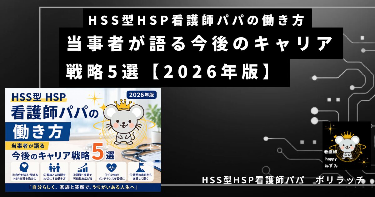 HSS型HSP看護師パパが「辞めずに」「壊れずに」「家族と過ごせる」キャリアを築くための、5つの具体的な働き方戦略と判断軸。読み終える頃には、明日から試せる次の一手が見えているはずです。