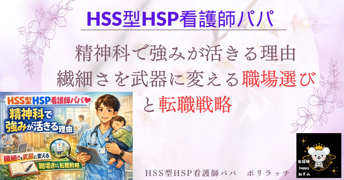 この記事では、HSS型HSP看護師パパが精神科で力を発揮できる具体的な理由と、転職を考える際の職場選びのポイントをお伝えします。